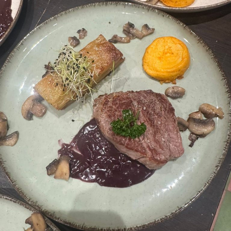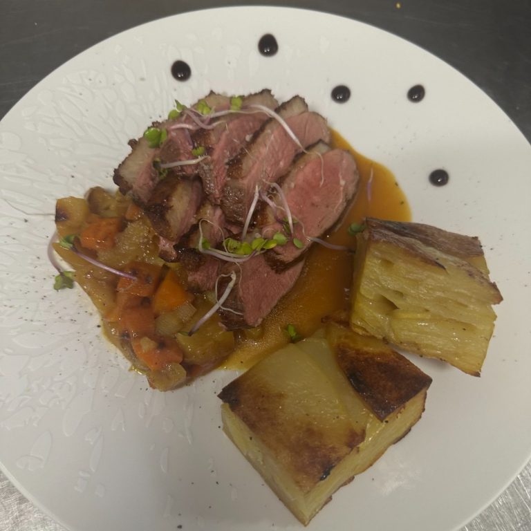 ou Filet de canette farci aux fruits secs, mousseline de patate douce, légumes d’antan glacés