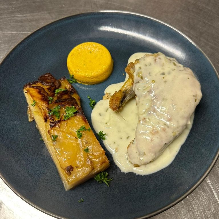Joue de cochon aux épices douces et au miel accompagné d’une timbale de pomme de terre et petits légumes